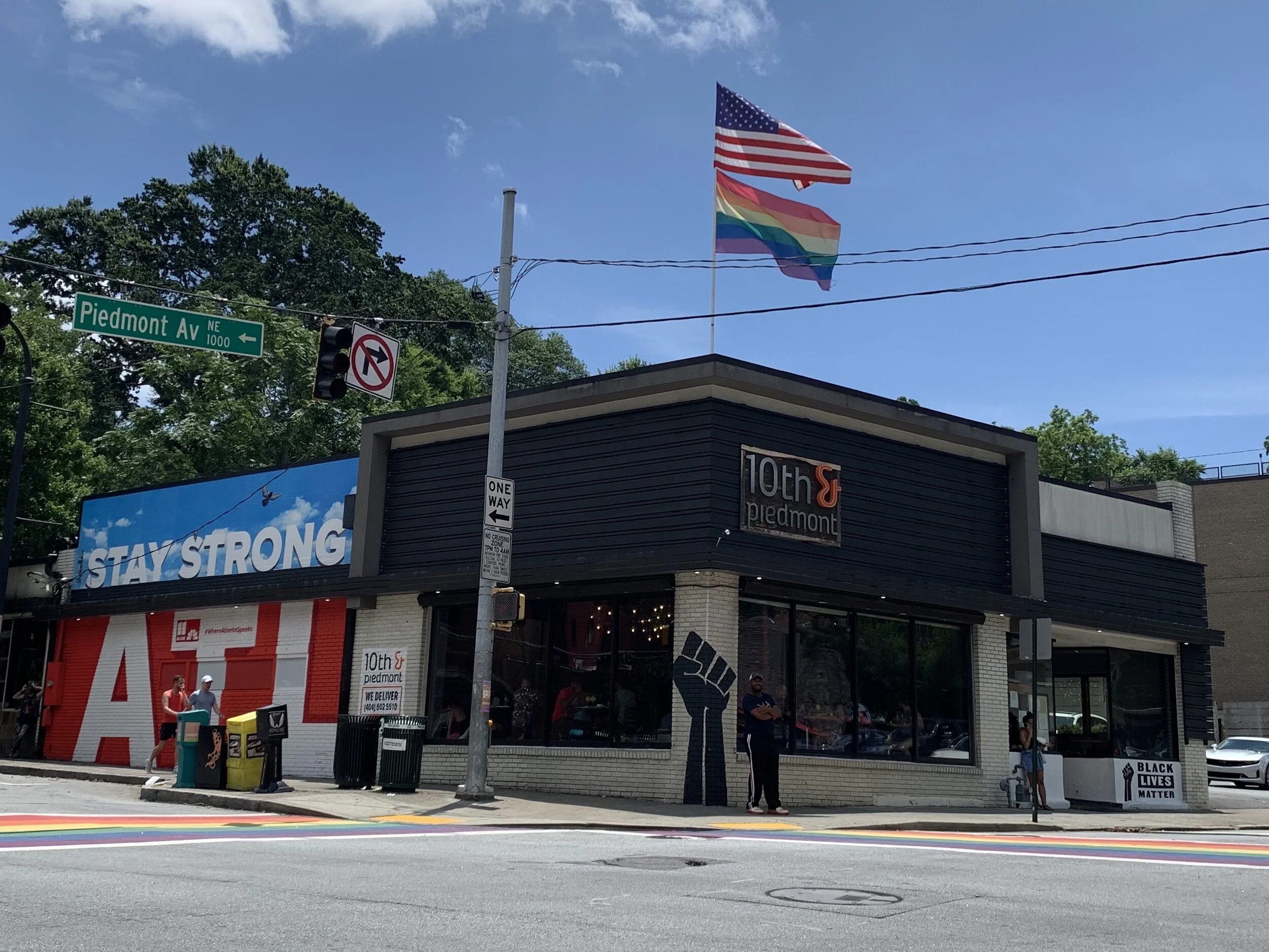 Stay Strong ATL @ 10th & Piedmont, sponsored by 11ALIVE in reaction to the COVID-19 Pandemic. Find this mural by the rainbow roads in Midtown, ATL.
